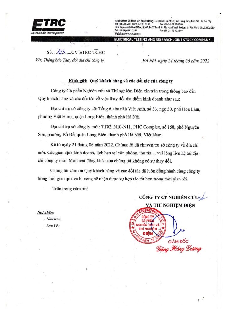 Nhằm mở rộng hoạt động sản xuất kinh doanh và nâng cấp cơ sở vật chất, Công ty cổ phần nghiên cứu và thí nghiệm Điện (ETRC) trân trọng thông báo đến Quý khách hàng, Quý đối tác địa chỉ trụ sở văn phòng mới tại: TT02, N10-N11, PHC Complex, số 158, phố Nguyễn Sơn, phường Bồ Đề, quận Long Biên, thành phố Hà Nội, Việt Nam.